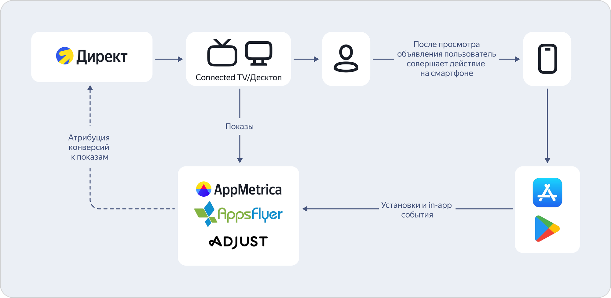 - Перфоманс-подход: с помощью кросс-девайс атрибуции можно отслеживать установки и конверсии в приложении после просмотра видеорекламы на CTV/десктопе.