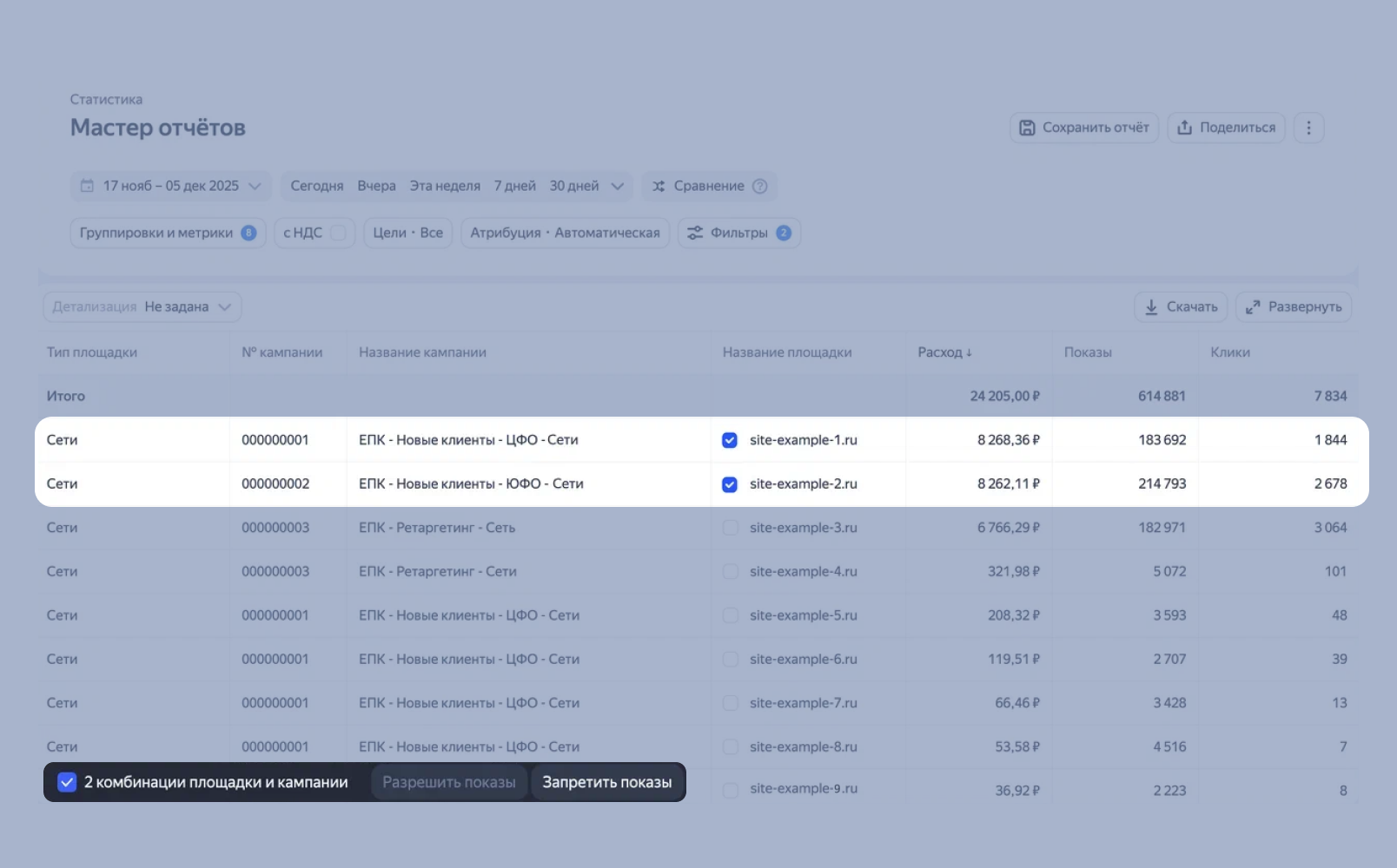 Площадки, на которых были запрещены показы, в новом Мастере отчетов выделяются серым цветом. Так вам будет проще найти их в общем списке.