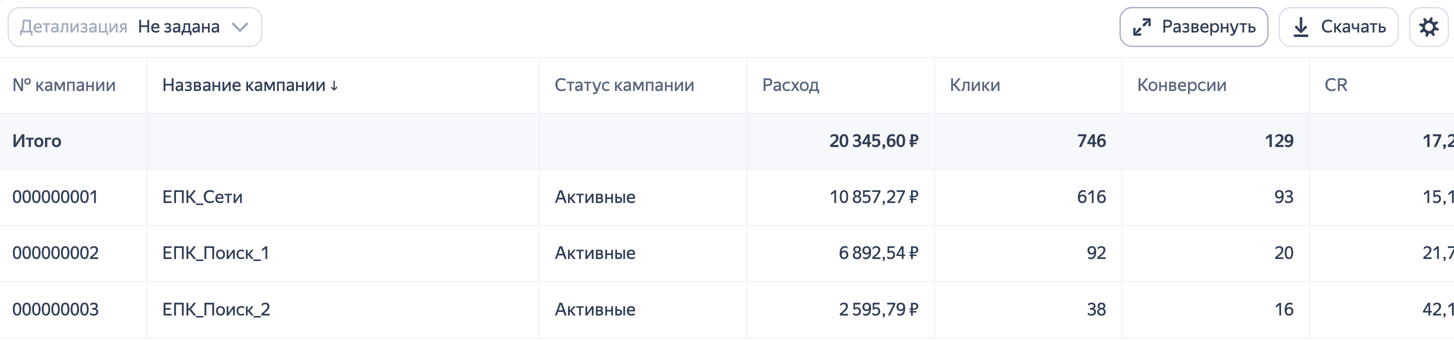 Кнопка Развернуть скрывает блок с настройками отчета, чтобы на странице отображалось больше данных.