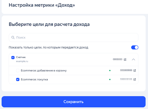 На странице по умолчанию выбраны подходящие цели, по которым передается доход: «Ecommerce: покупка», оплата в приложении или оплаченный заказ из CRM. При необходимости скорректируйте список целей. Для каждой цели есть подсказка, которая поможет понять, передавался ли по ней доход.
