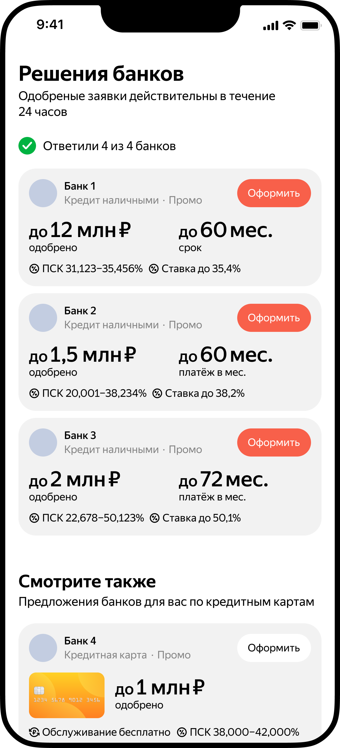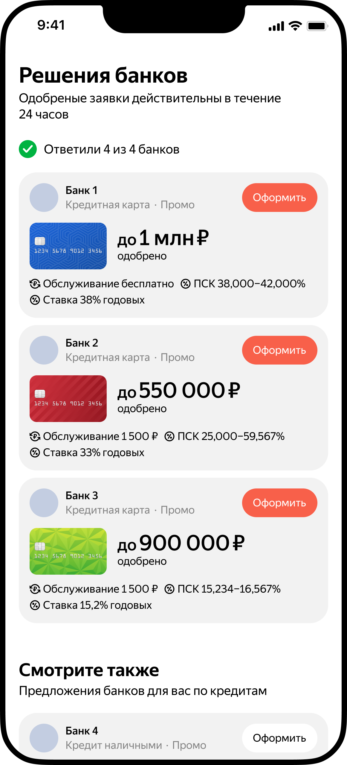 Продвижение доступно в тематических разделах Кредитные карты и Кредиты наличными. Они показываются в ответ на релевантные запросы пользователей в тематических блоках выдачи поиска и в Теме Поиска «Финансы».