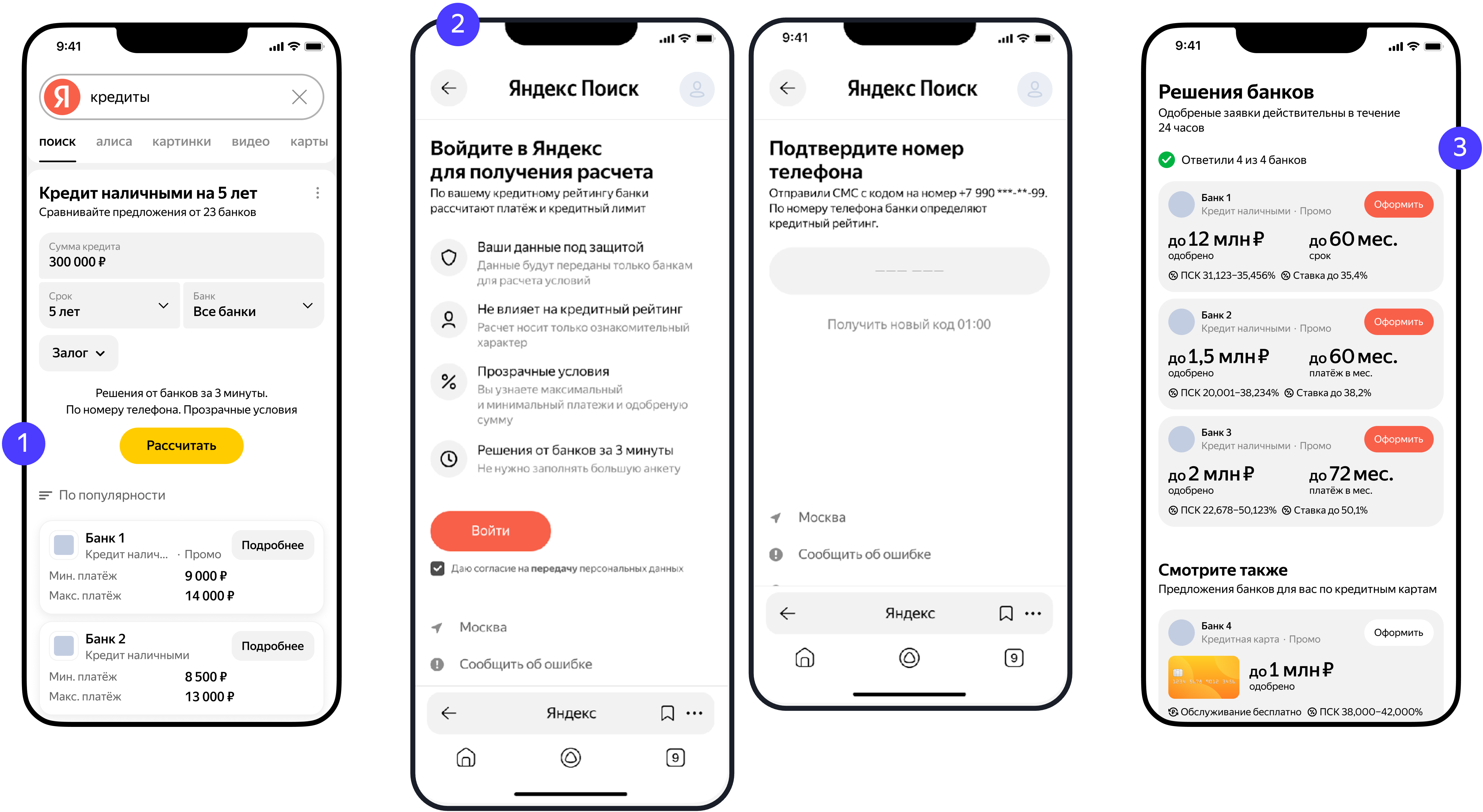 Авторизуется в Яндекс ID или подтверждает профиль. Затем происходит идентификация и анализ профиля пользователя на стороне банка.