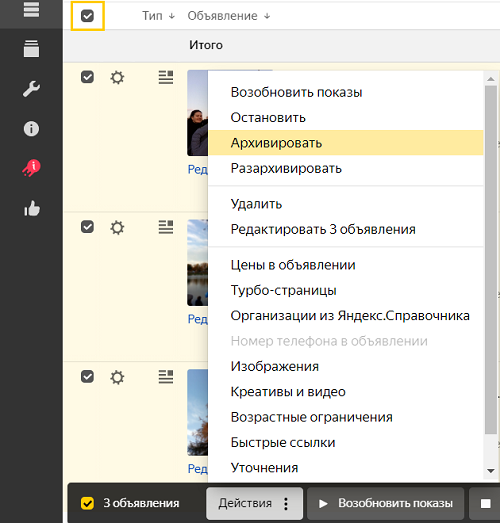 Действие будет выполнено только с теми объявлениями, для которых оно допустимо: например, архивировать можно только остановленные объявления и черновики.