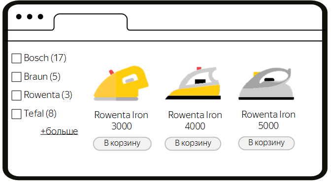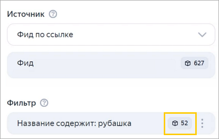 При настройке параметров фильтра Директ в режиме реального времени проверяет, сколько предложений соответствует выбранным критериям. Подсказка поможет избежать ситуации, когда под условия фильтра не попадает ни один товар и показы объявлений не идут.