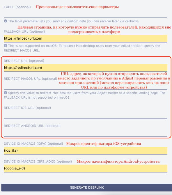 FALLBACK URL (резервный URL) — адрес конкретной целевой страницы, на которую вы отправляете пользователей, находящихся вне поддерживаемой платформы (т. е. клики из неподдерживаемой ОС). Важно: если трекер поддерживает iOS, Adjust может перенаправить macOS-трафик в магазин App Store. Для решения проблемы можно задать URL-адрес для macOS в поле REDIRECT MACOS.