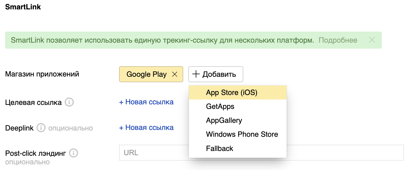 На основании необработанной универсальной трекинг-ссылки и токена трекера создайте многоплатформенную ссылку.