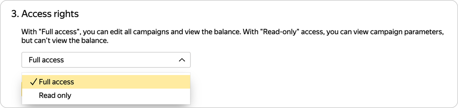 Yandex Direct’te çalışmak için daha önce kullanılmamış bir müşteri oturum açma adı belirleyin ve erişim haklarını seçin: