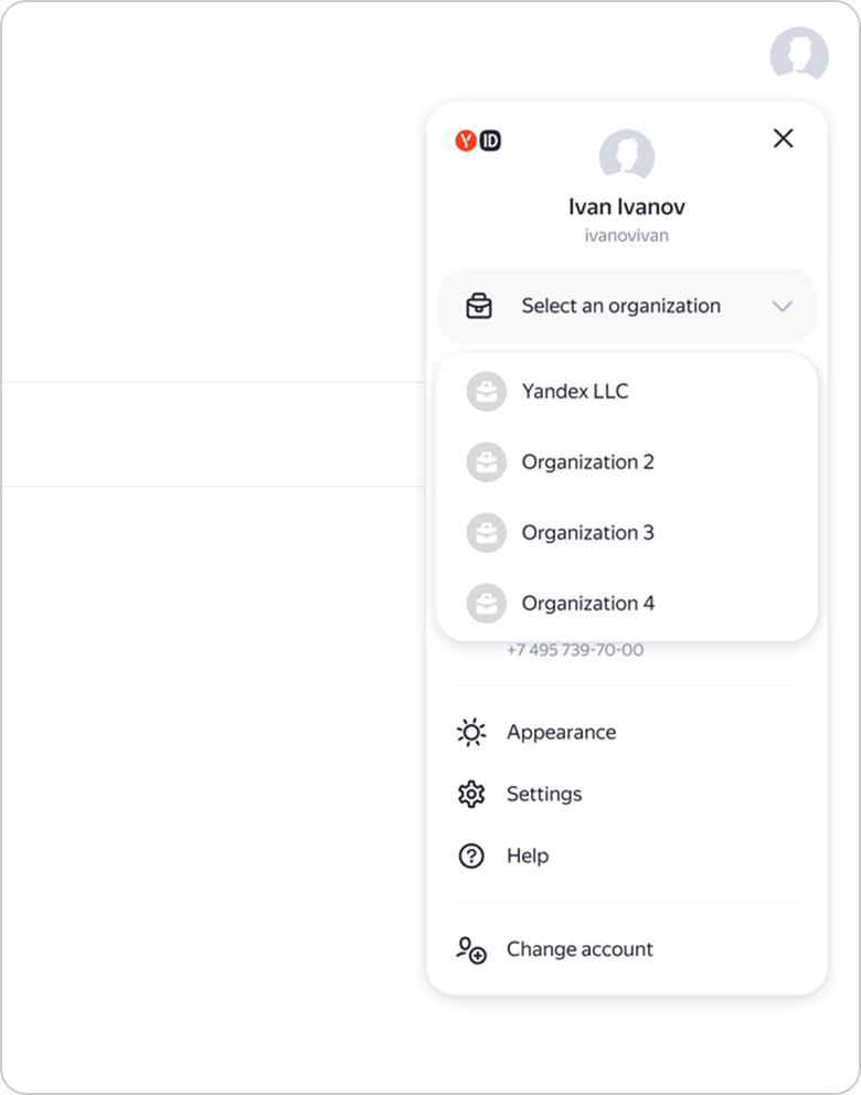 Yandex Direct’te sağ üst köşedeki hesap simgesine tıklayın ve menüden kuruluşu seçin. Müşteri kullanıcı paneline girmek için hesabınızdan çıkış yapmanız gerekmez.