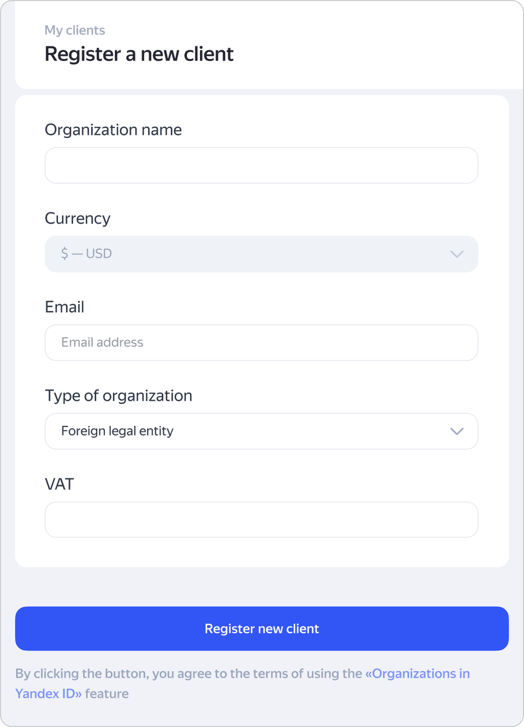 Yeni bir müşteri kaydet seçeneğine tıklayın, pasaport kuruluşu Yandex ID’de oluşturulacaktır.