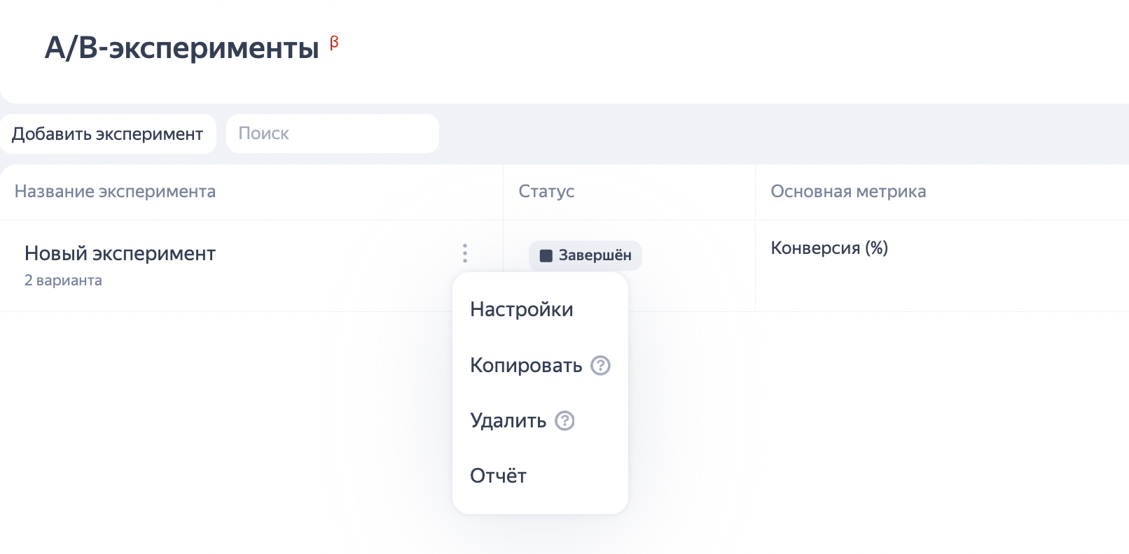 Deneyler listesindeki tabloda veya raporun sağ üst köşesinde Deneyi durdur seçeneğine basın. Tüm kampanyaları veya bazılarını seçin – bunlar mevcut ayarlarla ve örnekleme sınırlaması olmadan çalışmaya devam edecek. Tüm işaretleri kaldırırsanız – deneydeki tüm kampanyalar durdurulacaktır.