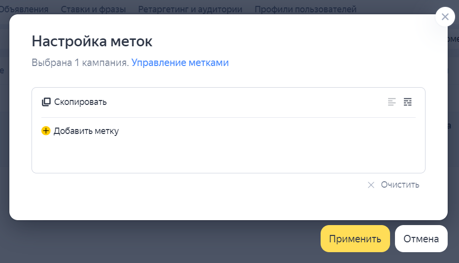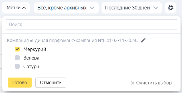 Yandex Direct’te, grupları filtrelemek için zaten oluşturulmuş etiketleri kullanabilirsiniz. Bunun için kampanyayı seçin ve kampanya gruplarına gidin. Etiketler'e tıklayın ve listeden bir veya birkaç etiket seçin.