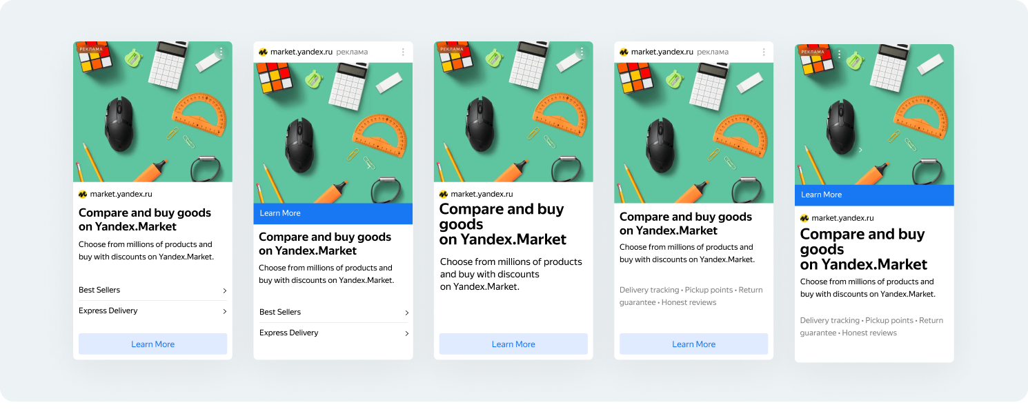 Yandex Reklam Ağı’nda, her gösterim için farklı eklemelerle otomatik olarak reklamlar toplayan, makine öğrenimi tabanlı bir teknoloji olan Smart Design çalışır.
