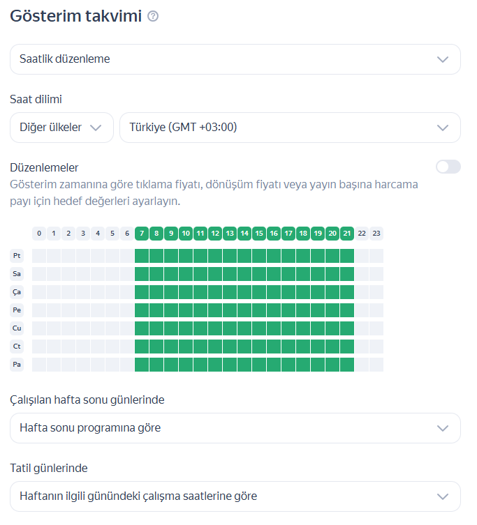 Kampanya ayarları sayfasındaki Gösterim Programı blokunda, reklamları ne zaman göstermek istediğinizi belirtin. Bunu şu şekilde yapabilirsiniz: