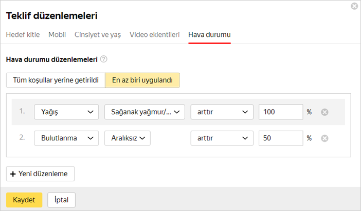 Hava koşullarına (hava sıcaklığı, yağış yoğunluğu ve bulutluluk) bağlı olarak teklif, fiyat veya dönüşüm değerini ayarlayabilirsiniz.