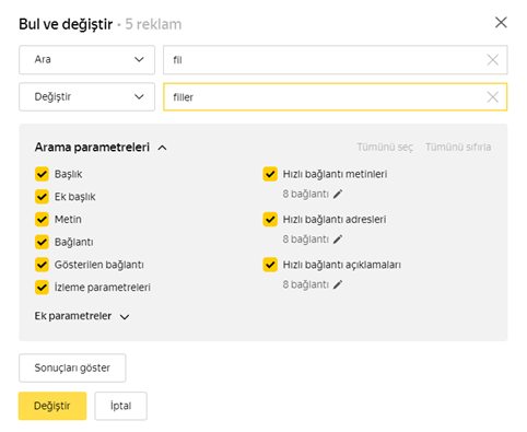 Arama ve değiştirme aracı aynı anda birkaç reklamda değişiklik yapmanızı sağlar. Reklamlardaki metinleri, hızlı bağlantıları ve bağlantıları düzenleyebilirsiniz.