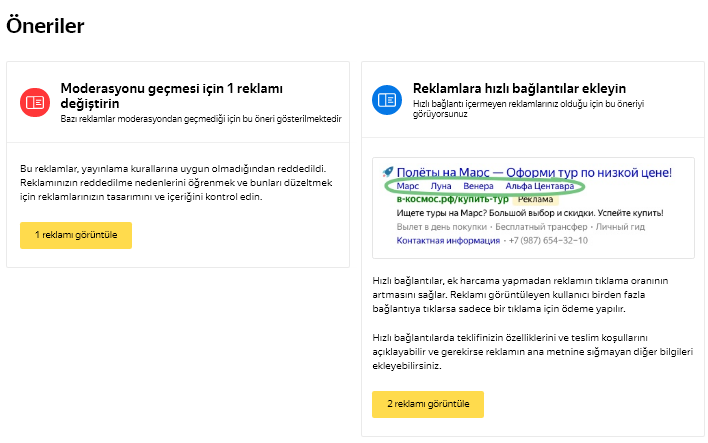 Ayrıca önerileri bir rapor şeklinde alabilirsiniz – Reklamınızı nasıl geliştireceğinizi öğrenin blokunda, Genel Bakış ve Rapor Sihirbazı sayfalarında ve Yandex Direct’teki Yenilikler Neler bildirimlerinde mevcuttur.