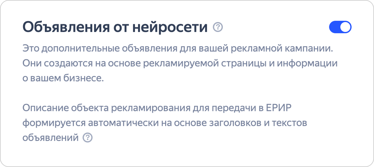 “Reklam” yasası, reklam açıklamalarının Birleşik İnternet Reklamı Siciline (ERİR) iletilmesini gerektirir. Bu tür açıklamalar Yandex algoritmaları tarafından otomatik olarak oluşturulur – reklamlarda görünmezler ve yalnızca ERİR’de kullanılabilirler. Açıklamalar bilginin eksiksizliğini ve doğruluğunu garanti etmez – gerekirse bunları güncelleyin.