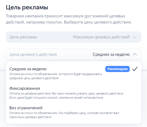 Bir ürün kampanyası, maksimum hedeflenen eylemin gerçekleştirilmesini amaçlar. Ürün kampanyası oluşturmadan önce Yandex Metrica sayacını sitenize kurun, hedefleri ayarlayın ve Yandex Direct hesabının bu sayaca erişimi olduğundan emin olun.