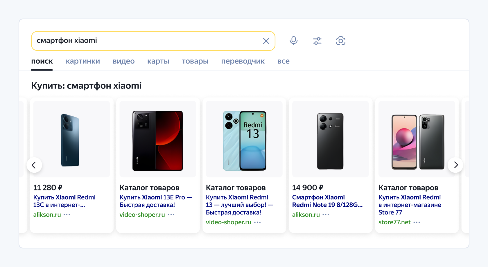 Ürün galerisi, farklı mağazaların ürün kartlarından veya farklı satıcıların otolarından oluşturulmuş bir döngüdür ve arama sonuçlarının üzerinde görünür.