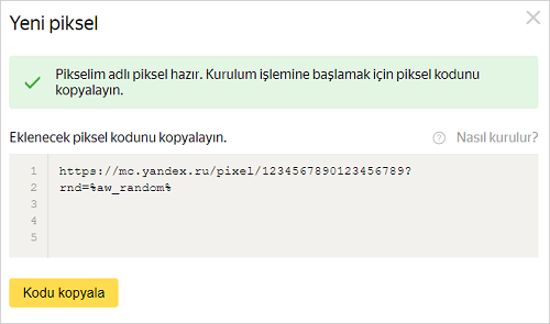 Yandex.Audience'ta piksel oluşturun. Pikseller sekmesinde Piksel oluştur butonuna tıklayın ve adını belirtin. Piksel kodu otomatik olarak oluşturulur. Daha fazla bilgi için Yandex Audience Yardım bölümüne göz atın.
