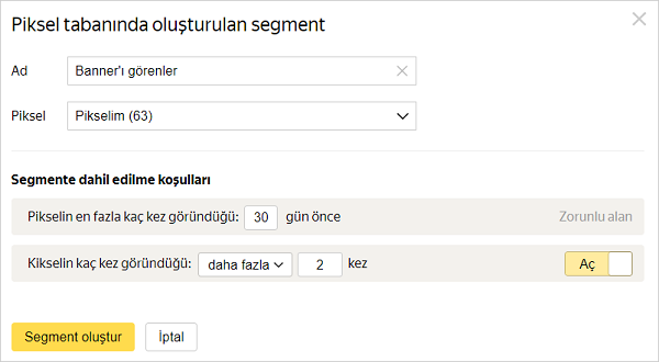 Yandex Audience’ta piksele dayalı bir segment oluşturun. Verilerin hesaplanması için istediğiniz zaman aralığını ve seçilen zaman aralığında kullanıcının reklamınızı kaç kez görmesi gerektiğini belirtin.