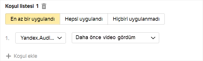 Her eylem için Yandex Audience üzerinde Yandex Direct kampanyasıyla aynı hesapta otomatik olarak ayrı bir “Yandex Direct’te Video” segmenti oluşturulacaktır. Segmentin adında kampanya verileri ve işlem türü gösterilir. Grupta en az bir video için işlem yapan kullanıcılar bu segmente dahil edilir.