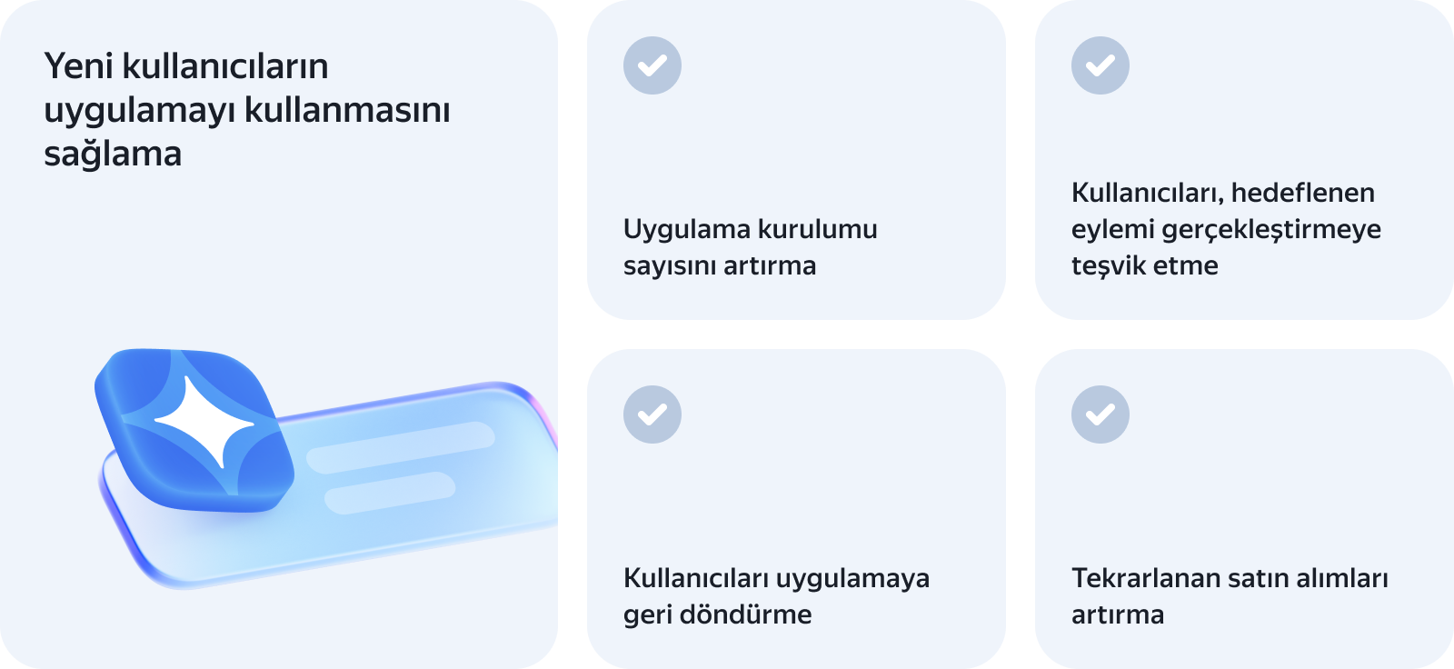 Mobil uygulama reklamları, iOS ve Android uygulamalarını tanıtmak için kullanılan bir Yandex Direct aracıdır. Bu sayede geliştiriciler ve yayıncılar yeni kullanıcılar çekebilir veya uzun süredir uygulamaya girmeyenleri geri getirebilir.