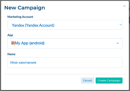 Yandex Direct hesabını ve uygulamayı seçin, kampanya adını girin.