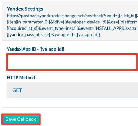 Yandex App ID alanını doldurun ve Save Callback’a basın.