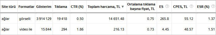 Örneğin, ağlardaki kampanyanız için farklı formatlarda reklam gösterimleri yapılıyor. Formatlara göre istatistikleri karşılaştırın. Hedefe yönelik oturum fiyatı ve hedefe yönelik oturum oranıyla ilgili elde edilen veriler videoların çok etkin bir hedef kitle çekme aracı olduğunu kanıtlamaktadır. Video içeren reklamların gösterim olasılığını artırmak için teklif ayarlamalarını artırın.