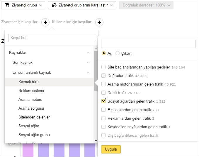 Metrica segmenti oluşturmak için herhangi bir rapora gidin ve ziyaret ve kişi seçme koşullarını ayarlayın. Örneğin, bu şekilde siteye sosyal medya platformlarından gelen ziyaretçiler seçilebilir.