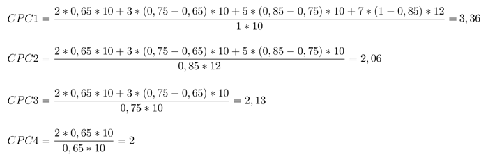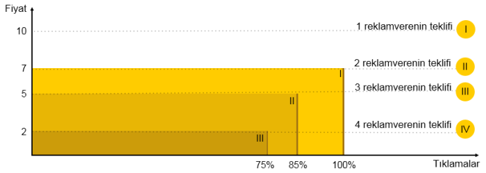 Dört reklamveren, üç reklam için, yani üç pozisyon için blokta gösterim için rekabet eder. Teklifleri 10, 7, 5 ve 2 lira, kalite katsayıları ve tahmini CTR’lar aynıdır. Birinci pozisyonun maksimum trafik getirdiğini, ikinci ve üçüncü pozisyonların ise sırasıyla maksimum trafiğin %85 ve %75’ini getirdiğini varsayalım.