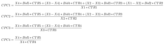 Reklam blokunda X1, X2, X3, X4 tıklanabilirlik katsayılarına sahip 4 gösterim yeri varsa ve blokta gösterim için 5 reklamveren rekabet ediyorsa (reklam teklifleri Bid1-Bid5, bu gösterim için tahmini tıklanabilirlikler – CTR1-CTR5), alınacak tıklama ücreti aşağıdaki formüllerle hesaplanacaktır: