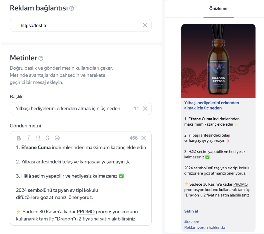 2. Reklam başlığını ve metni ekleyin. Teklifinizi, avantajlarını veya özelliklerini açıklayın. Reklamdaki metnin maksimum uzunluğu – 764 karakter. Yayın sırasında gereksiz boşluklar veya satır sonları kaldırılabilir. Ancak kelimeler arasındaki boşluklar veya boş paragraflar kaldırılmayacaktır.