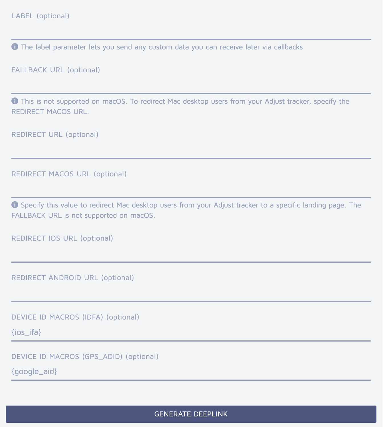 REDIRECT URL / MACOS / iOS / Android (URL / MACOS / iOS / Android yönlendirme) – varsayılan olarak uygulama mağazasına olan Adjust yönlendirmesini değiştirmek ve bunun yerine kullanıcıları belirli bir URL adresine yönlendirmek için yönlendirmenin URL adresini ekleyin. Kullanıcılar cihaz platformuna göre (REDIRECT MACOS / iOS / Android) yönlendirilebilir veya hepsi tek bir konuma (REDIRECT URL) gönderilebilir.