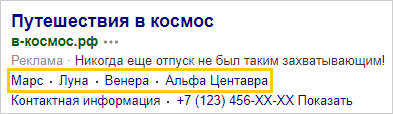 最多可以在广告中添加八个快速链接。 这些链接指向宣传网站页面、Yandex Market 或社交媒体上的产品或服务页面。 快速链接会显示到 Yandex 搜索结果页面和广告网络联盟(YAN 和合作伙伴平台)中。 展示的快速链接数量可能因网站和设备而异。 快速链接的最大数量显示在搜索结果的扩展式广告形式中。