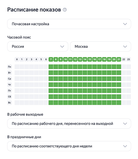 Yandex Direct 广告默认全天投放。 这样可以帮助您吸引大部分潜在客户。 如果您想要在不同的时间投放不同的广告,请使用时间定向来安排广告展示。
