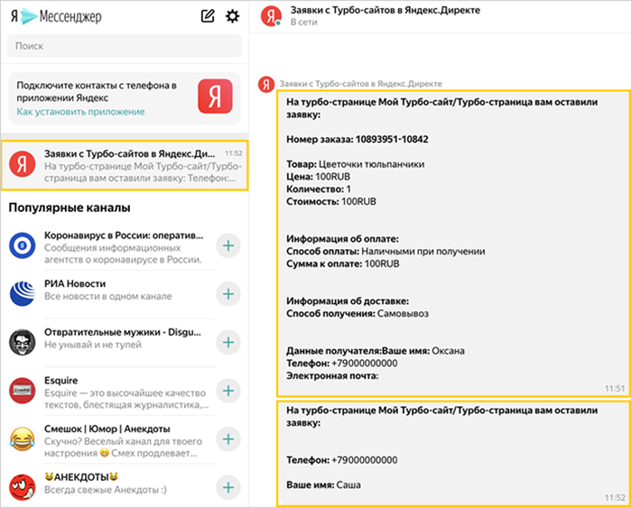 Yandex Messenger 会接收来自 Products 部分中 Form 和 Order forms 的请求。 Yandex Messenger 和电子邮件使用相同的请求字段。