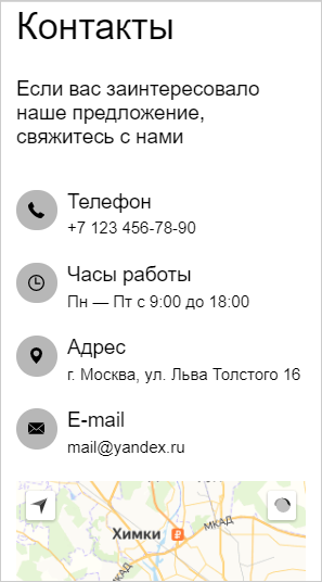 在 Contacts 部分,添加电话号码、地址、电子邮件、营业时间以及社交媒体页面链接。 选择带地图的联系方式,以便用户轻松定位您的位置。 您可以在 Yandex 地图大师中创建地图。 而后,可以在联系方式部分添加地图代码或地图链接,同时添加路线图。 您可以将地图置于联系方式右侧,也可以扩展到整页宽度。