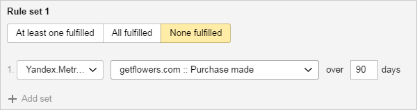 例如,您可以向过去 30 天内未在网站上购买商品的老客户投放折扣广告。 要完成此操作,请根据 CRM 数据细分现有客户。 在再营销和受众挑选部分中输入细分和相应的 Yandex Metrica 目标。