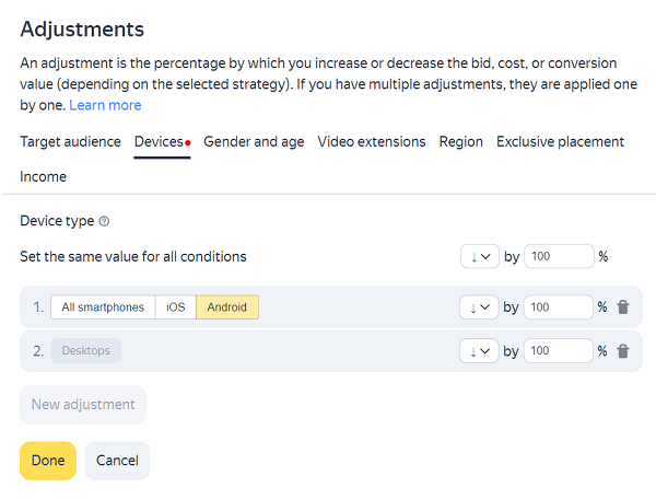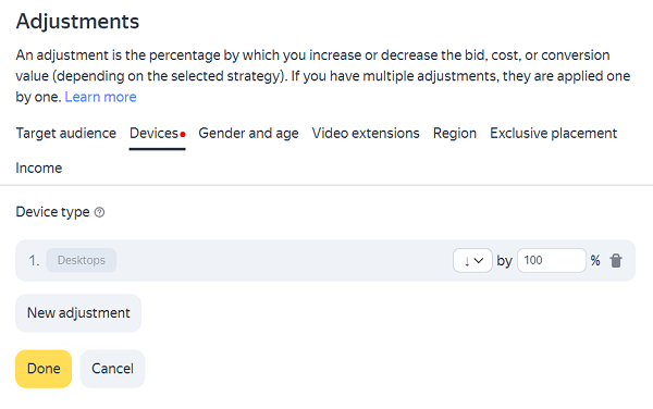 例如,如果给关键词指定的出价为 60 卢布,并且调整设置为提高 100%,那么实际出价将为 120 卢布。