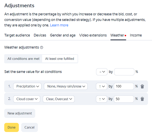 调整使用来自 Yandex Weather(精确到小时)的数据,并根据用户所在地区进行应用。 它们在广告组级别可用于展示横幅和整合效果广告系列。