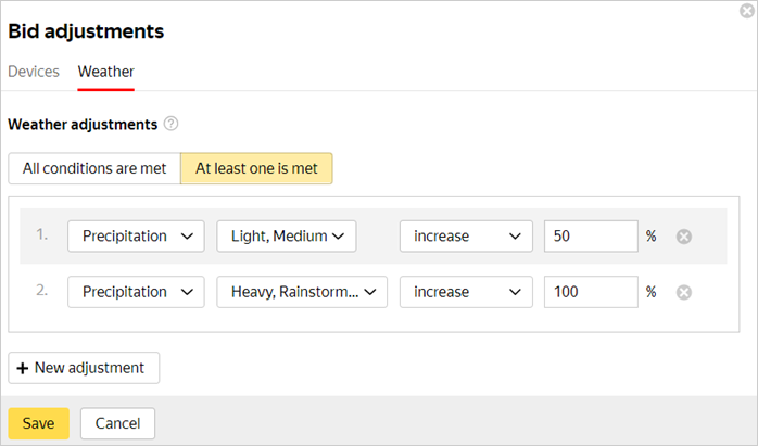 天气不好时,对外卖广告使用更高的出价。 添加出价调整到您的外卖广告组。 在 Weather 标签中选择出价调整条件时,点击 At least one fulfilled。 根据降雨强度设置调整:少量或分散降雨时,将出价提高 50%;但是在大雨、暴雨和暴风雪时,将出价提高 100%。