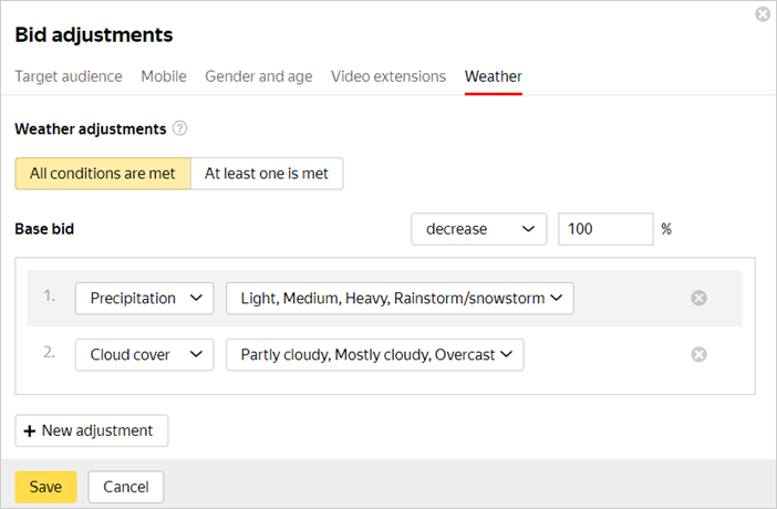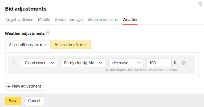 添加出价调整到“其他”广告组。 在 Weather 标签中选择出价调整条件时,点击 All fulfilled。 如果有降雨和云,则将出价降低 100%。 在这些情况下,不投放广告。