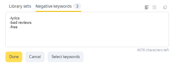 为了防止 Yandex Direct 针对不相关的搜索投放广告,可添加否定关键词。