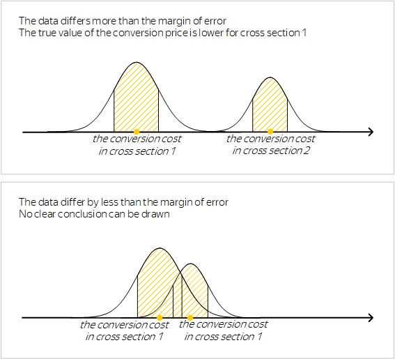 当比较两个数据细分的统计数据时,请考虑统计误差 —— 获取的数据与真实值之间的偏差。 如果该数据的偏差小于误差范围,则无法得出其中一个数据细分中的结果优于另一个数据细分的结论。
