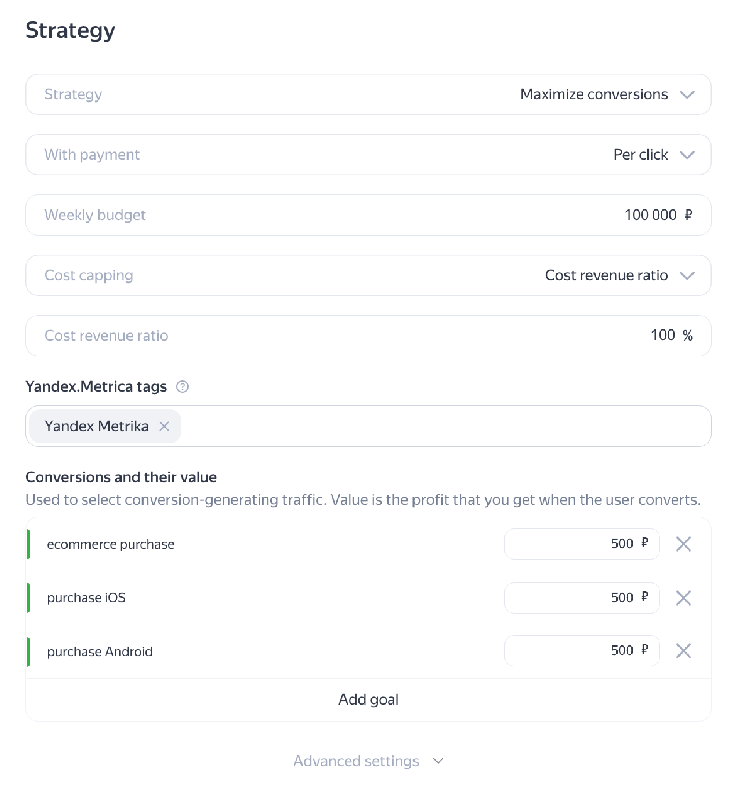 4. 设置动态目标值。 要根据应用内目标的广告支出比例指标优化广告系列,请设置事件收入的收集和发送至 Yandex Direct。