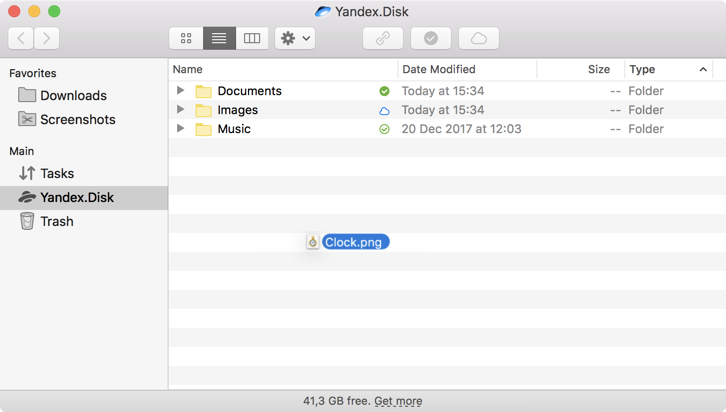 Open the Yandex Disk folder in Finder and copy the files to it. This way files are saved both on the computer in the Yandex Disk folder and in the Yandex Disk cloud.