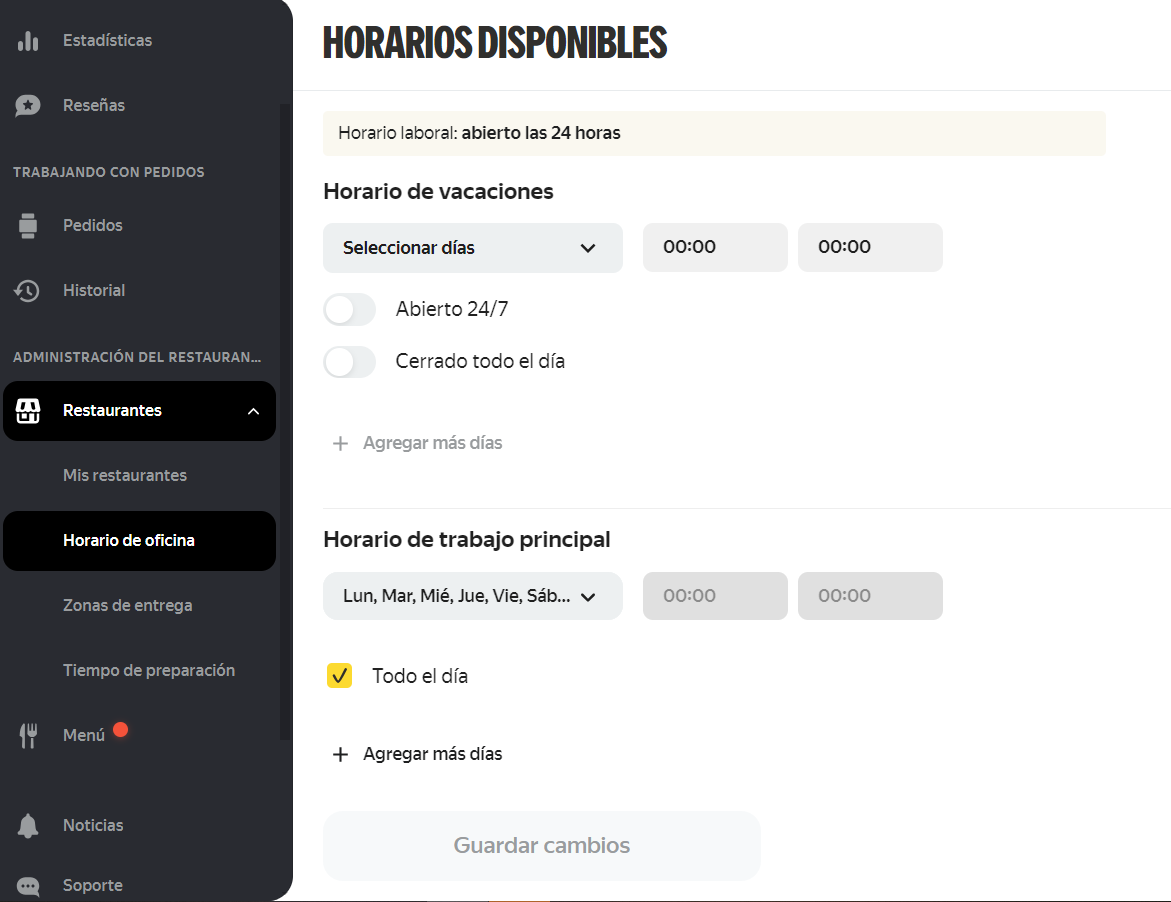 Cambiar el horario de trabajo sólo está disponible para las cuentas con acceso ampliado al área de trabajo. Puede obtener dicho acceso a través de su cuenta personal: sección Soporte → Área privada → Acceso a la cuenta personal.