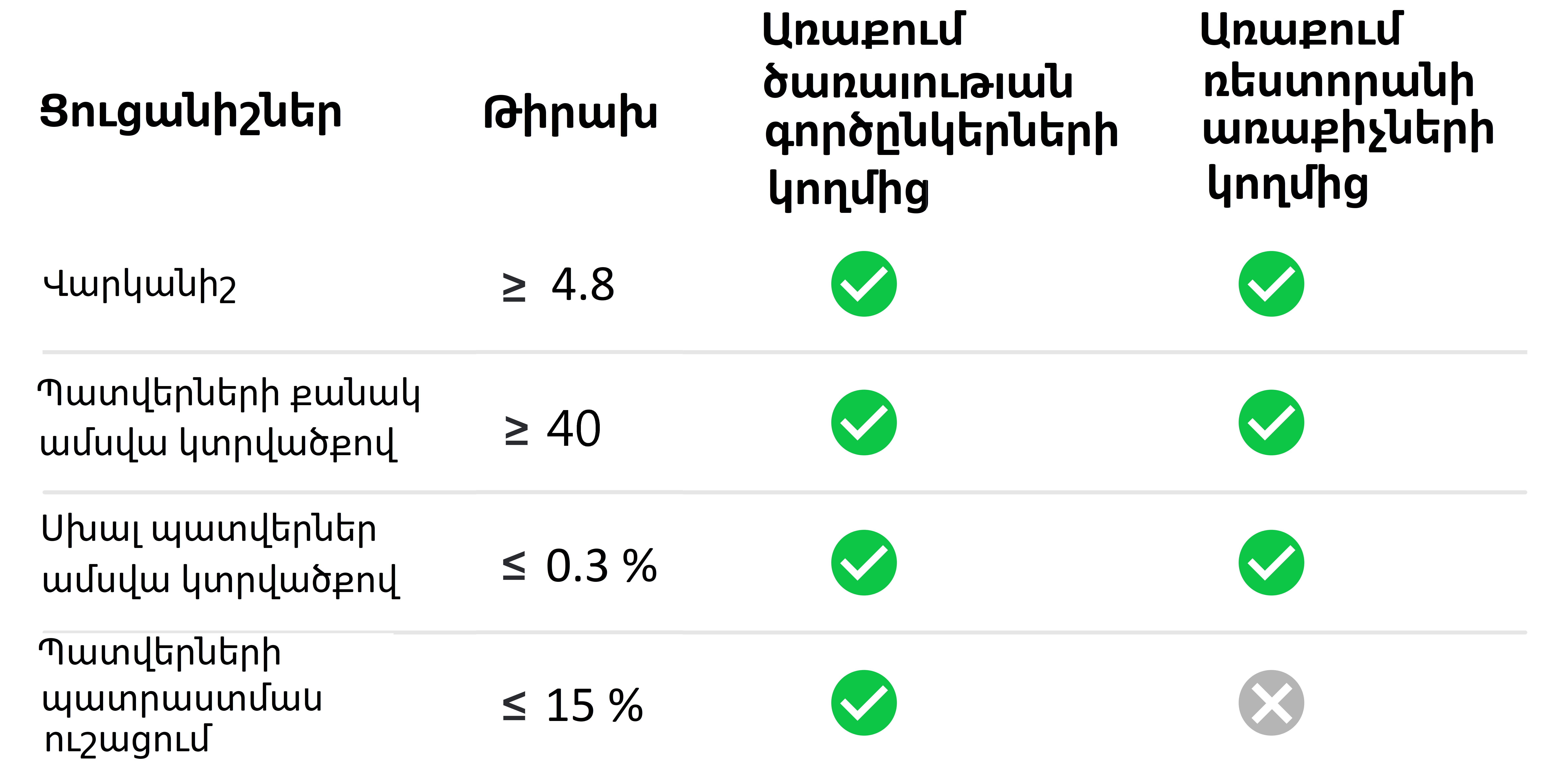 Որակի ցուցանիշ — բաժնում հավաքել ենք ռեստորանի աշխատանքի բոլոր այն ցուցանիշները, որոնք կարևոր են օգտատերերի համար: Այստեղ կարող եք հետամուտ լինել ռեստորանի կողմից պատվեր կատարելու որակին՝ այն պատրաստելու, հավաքելու և փոխանցելու մասով։